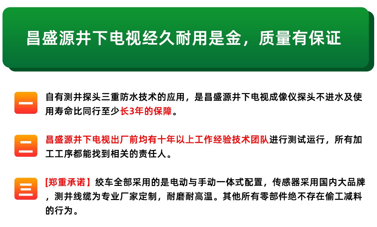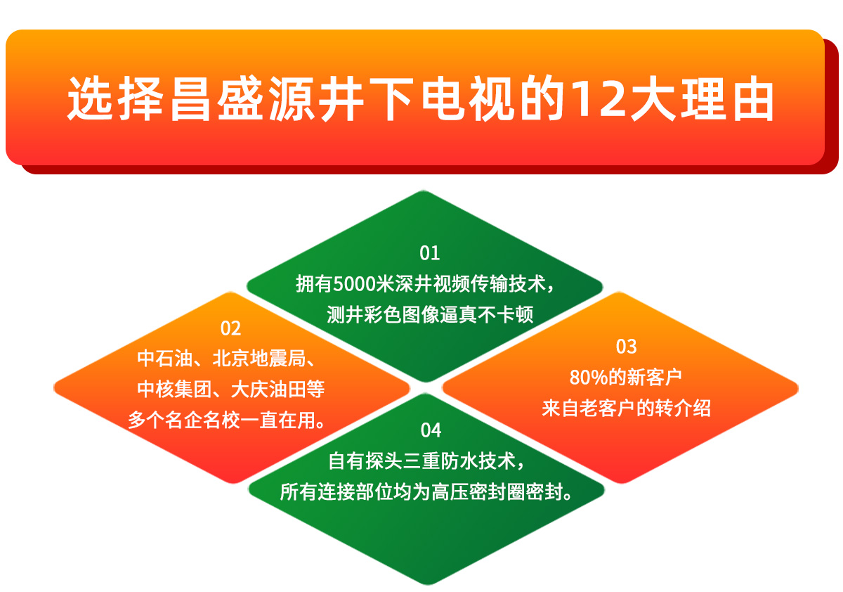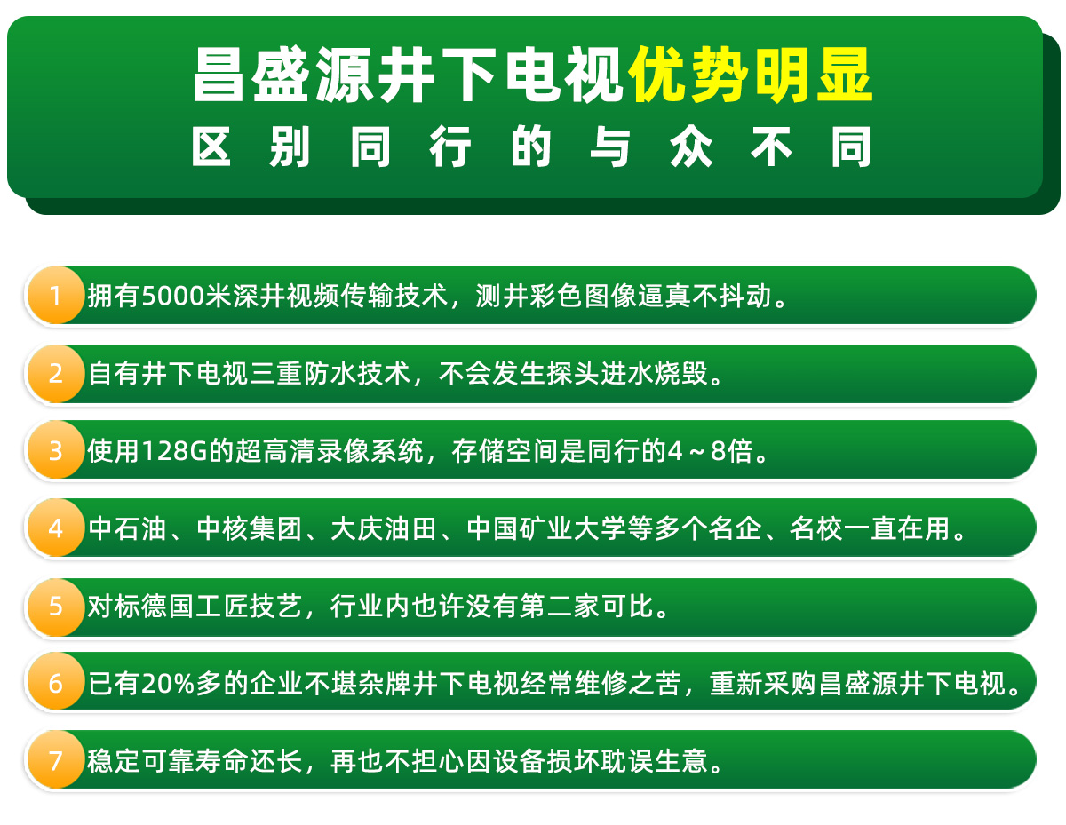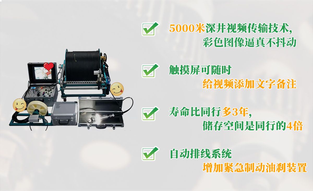 1.采用三重防水技術(shù)在井下電視探頭的制造上,有別于其他同行的制造工藝;防水線纜外層破損也不影響使用,不會(huì)造成探頭進(jìn)水。 2. 探頭采用“太鋼”304不銹鋼外殼,耐腐蝕不生銹。優(yōu)化機(jī)加*,密封結(jié)構(gòu)更合理,沒(méi)有漏水之慮。 3.采用進(jìn)口索尼CCD攝像頭,增加抗電磁干擾濾波器,不懼各種電磁干擾,抓拍錄像兩不誤,圖像更穩(wěn)定清晰。 4. 攝像頭360度無(wú)限度旋轉(zhuǎn),速度、焦距手動(dòng)可調(diào),深度計(jì)米器支持現(xiàn)場(chǎng)步長(zhǎng)設(shè)置。 5. ABS控制箱防水等級(jí)IP68,增加輸入鍵盤,中英文輸入,現(xiàn)場(chǎng)就直接可以錄入井號(hào)及各種需要錄入的數(shù)據(jù),*作更方便快捷。 6. 定制*耐高溫耐磨損抗拉防水電纜,耐溫70攝氏度,抗拉強(qiáng)度可承受4000米電纜拉力。 |