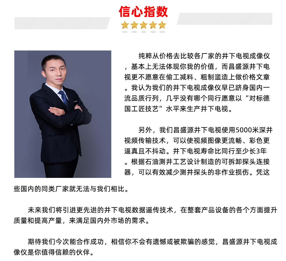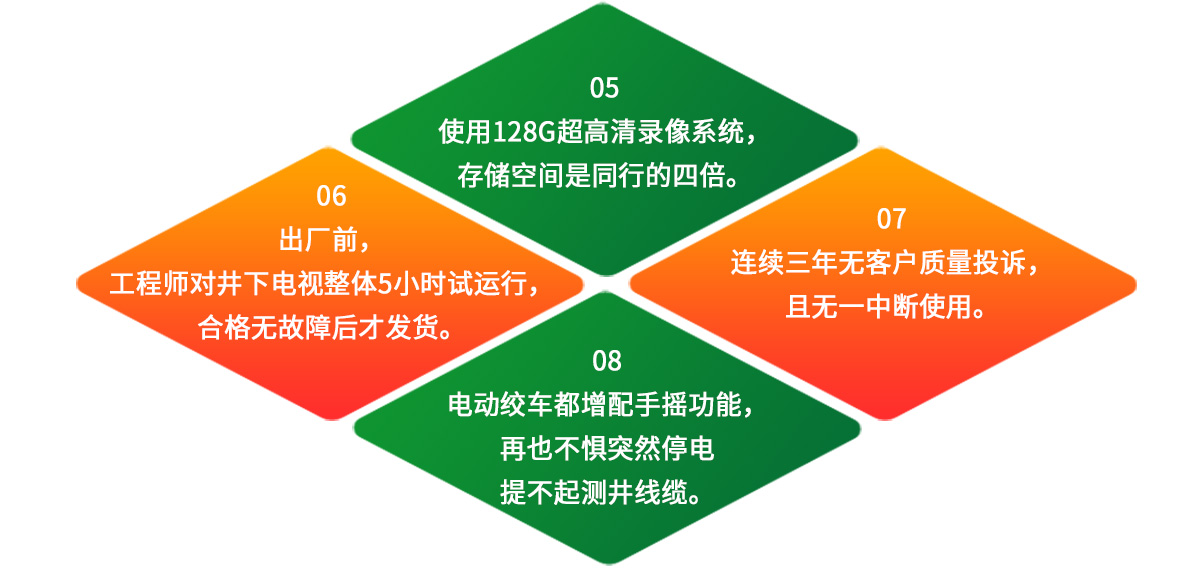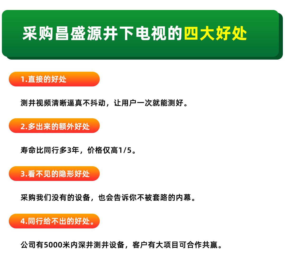 1.采用三重防水技術(shù)在井下電視探頭的制造上,有別于其他同行的制造工藝;防水線纜外層破損也不影響使用,不會(huì)造成探頭進(jìn)水。 2. 探頭采用“太鋼”304不銹鋼外殼,耐腐蝕不生銹。優(yōu)化機(jī)加*,密封結(jié)構(gòu)更合理,沒(méi)有漏水之慮。 3.采用進(jìn)口索尼CCD攝像頭,增加抗電磁干擾濾波器,不懼各種電磁干擾,抓拍錄像兩不誤,圖像更穩(wěn)定清晰。 4. 攝像頭360度無(wú)限度旋轉(zhuǎn),速度、焦距手動(dòng)可調(diào),深度計(jì)米器支持現(xiàn)場(chǎng)步長(zhǎng)設(shè)置。 5. ABS控制箱防水等級(jí)IP68,增加輸入鍵盤,中英文輸入,現(xiàn)場(chǎng)就直接可以錄入井號(hào)及各種需要錄入的數(shù)據(jù),*作更方便快捷。 6. 定制*耐高溫耐磨損抗拉防水電纜,耐溫70攝氏度,抗拉強(qiáng)度可承受4000米電纜拉力。 |
